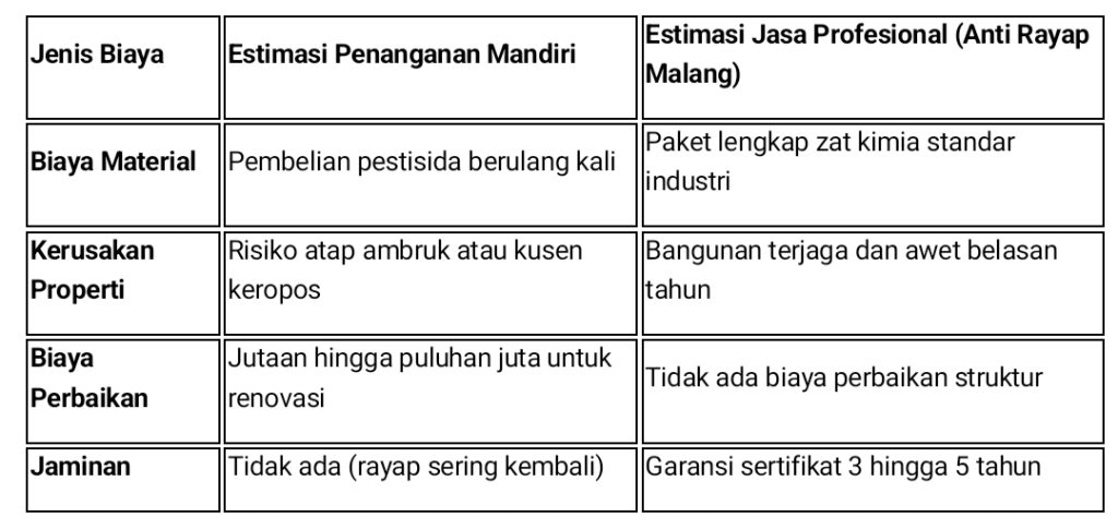 Jenis Biaya Estimasi Penanganan Mandiri Estimasi Jasa Profesional (Anti Rayap Malang)