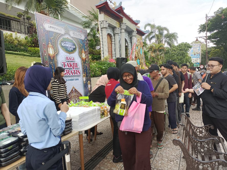 Reportasemalang – Menjelang waktu berbuka puasa, ribuan takjil gratis dibagikan manajemen Malang Town Square (Matos) kepada masyarakat yang melintas, Rabu sore (4/3/2026). Meski sempat diguyur gerimis, warga tetap antusias mengantri dengan tertib untuk mendapatkan takjil gratis.